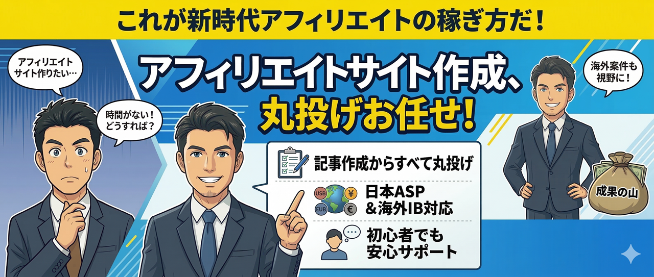 当社「丸投げアフィリエイト」を利用して、収益を生むアフィリエイトサイトを構築し、ビジネスオーナーを目指しましょう。